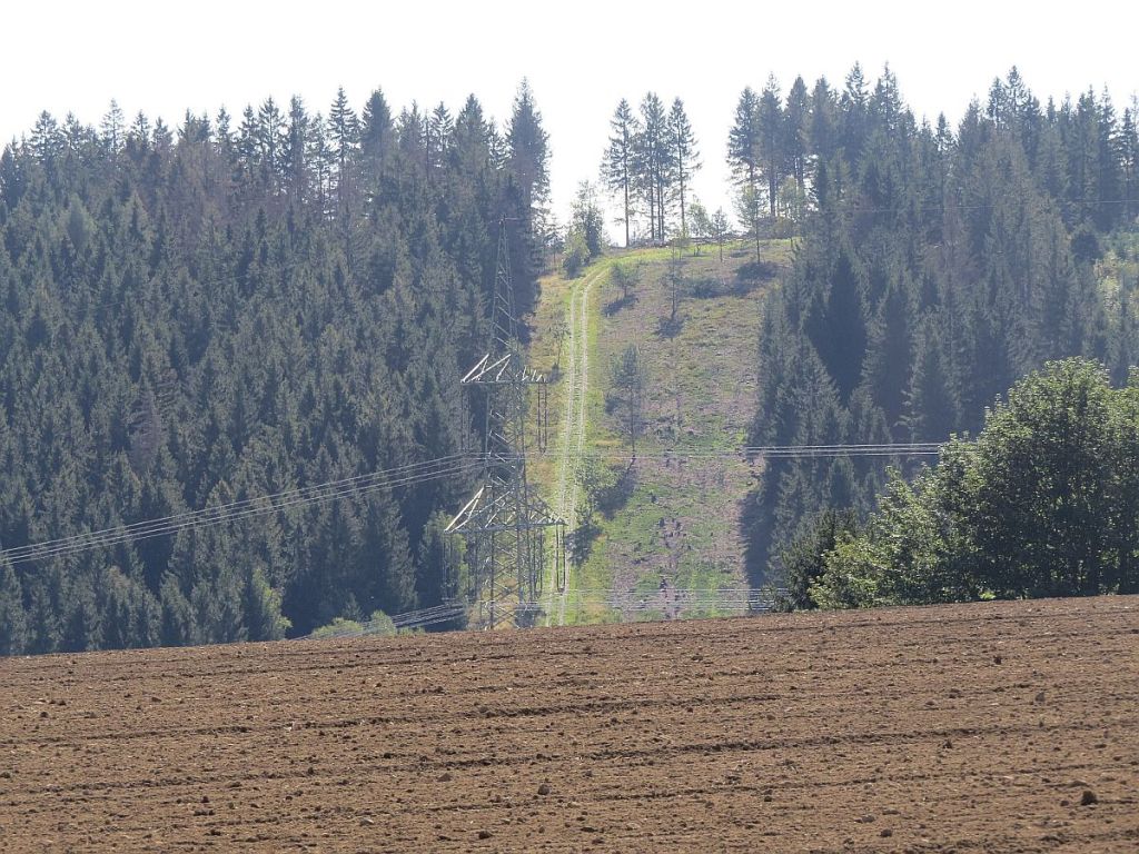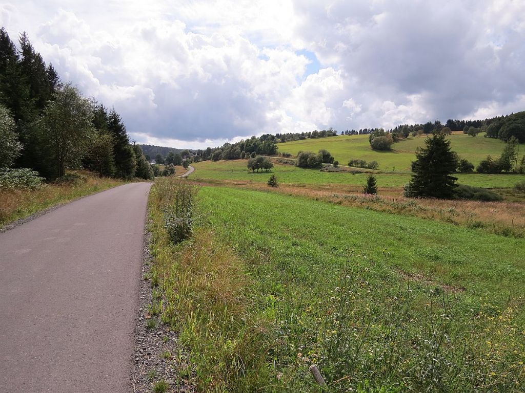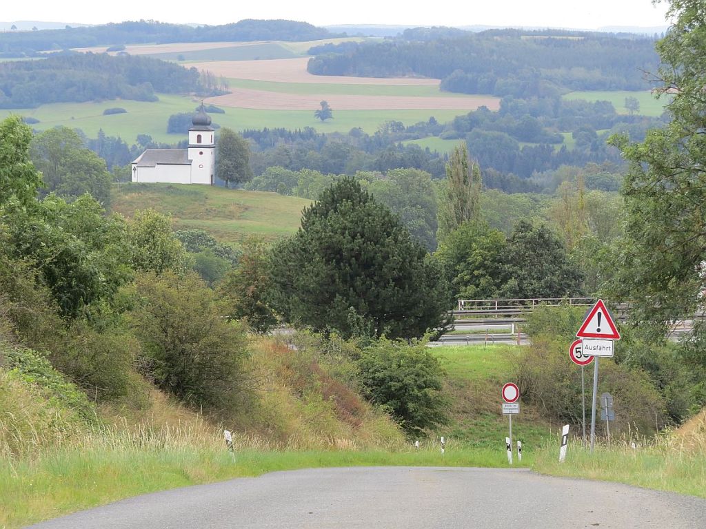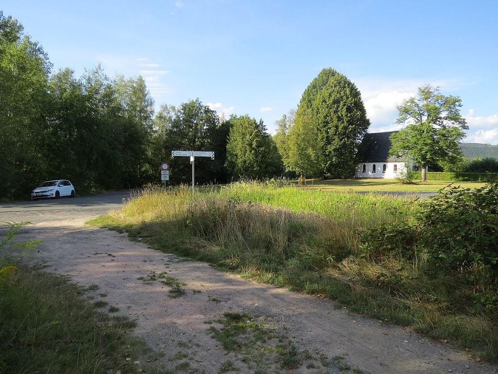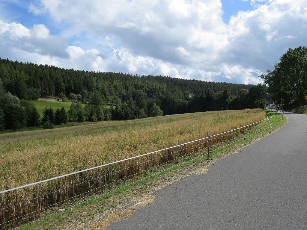 Mit wenigen kurzen Anstiegen rollte es auf guten Straßen immer entlang der Grenze. Leider gab es auf der Strecke nicht einen einzigen Hinweis über die geschleiften Dörfer, Höfe etc. Und dies gab es auch hier im Vogtland. Sehr schade. Über die Autobahn A72 kann man die Kapelle St. Clara von Heinersgrün erblicken.
