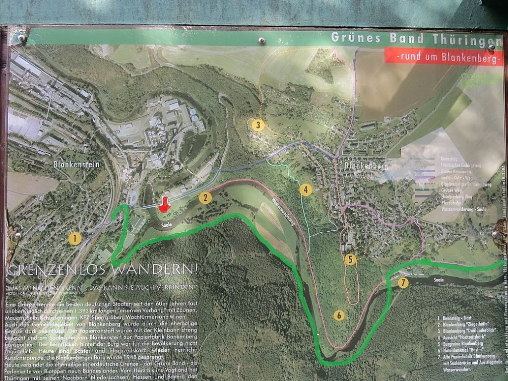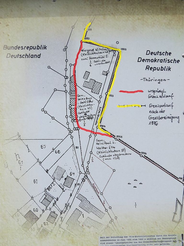 An dieser Stelle standen einmal fünf Häuser. Sie wurden für Grenzsicherungsmaßnahmen abgerissen. Die nächste Aufnahme habe ich vom unteren Bogen der Saale aus gemacht. Die Brücke steht neben der Nr. 7 im Plan.