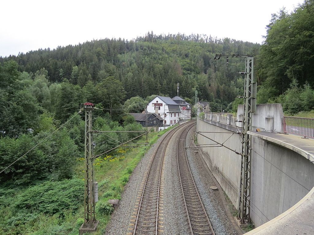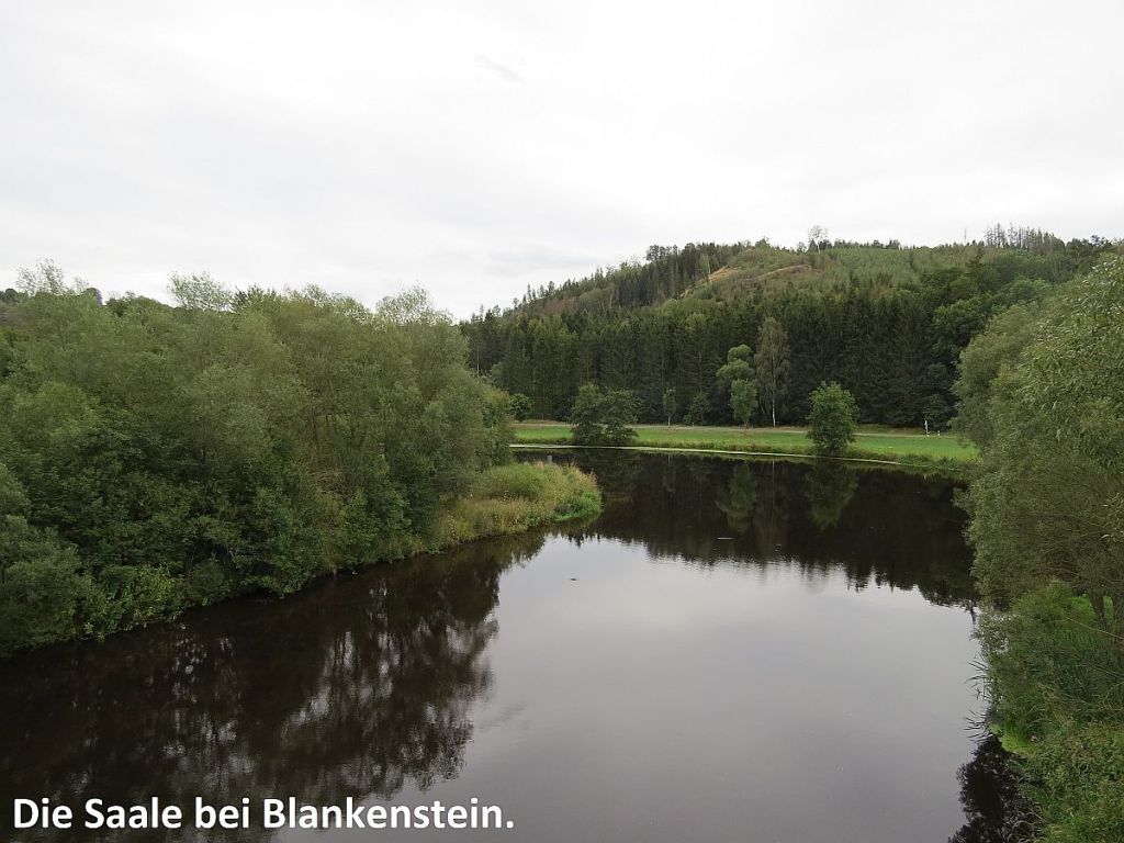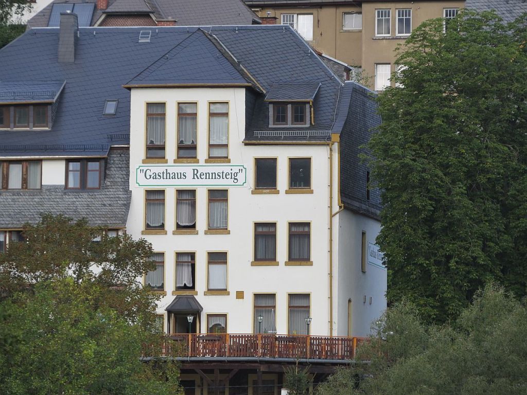 Es ging runter über die Selbitz und entlang der Saale auf der Straße nach Eisenbühl. Vorher noch ein Blick zum „Gasthaus Rennsteig“ mit der Saale im Vordergrund.
