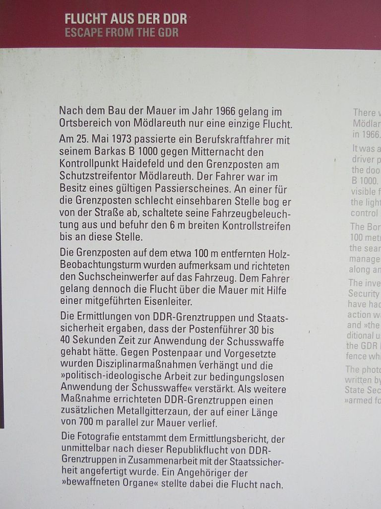 Laut Akten gab es hier nur einen geglückten Fluchtversuch. Auf insgesamt 11 Seiten wurde dieser Vorfall durch das MFS aufgeschrieben und entsprechende Gegenmaßnahmen, auch Verschärfung zu Nutzung des Schießbefehls, notiert.