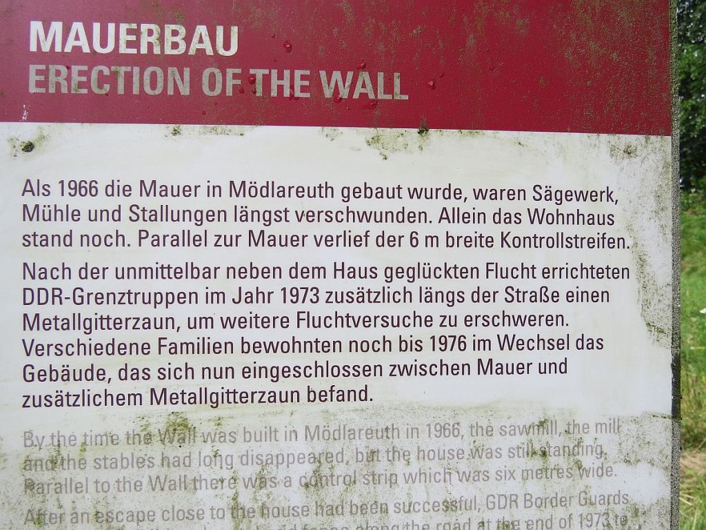 Ich hatte mich im Bushäuschen untergestellt und wurde wenig später vom Bauern des ältesten Hauses im Dorf – der Nummer 1 – eingeladen. Bei einem Becher Kaffee (die Frau hatte den Kaffee schon aufgesetzt) und Brötchen mit ganz frischem Honig erzählten sie mir dann beide etwas vom Alltag in der DDR. Von Ihrer Haustüre konnten sie immer auf die Mauer sehen. Hinter der Mauer standen sehr häufig die „Westverwandten“ und haben nach drüben geschaut. Winken war für die „Ostbewohner“ strengstens verboten. Den Mauerrest als Mahnmal finden beide sehr gut.