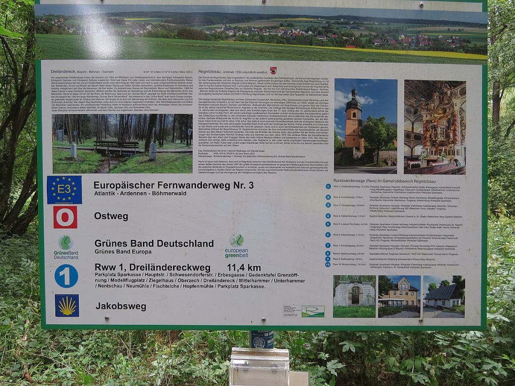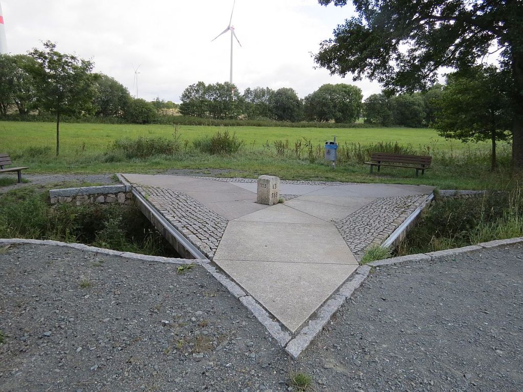 Hier habe ich mich dann eine gute Stunde aufgehalten und bin sehr glücklich, hier gesund angekommen zu sein. In Regnitzlosen, der vorletzte Übernachtsort, ca. 5 km entfernt, gibt es auch noch einen Dreiländerbrunnen.